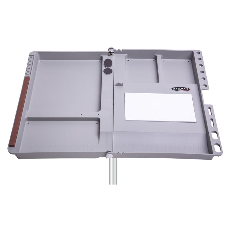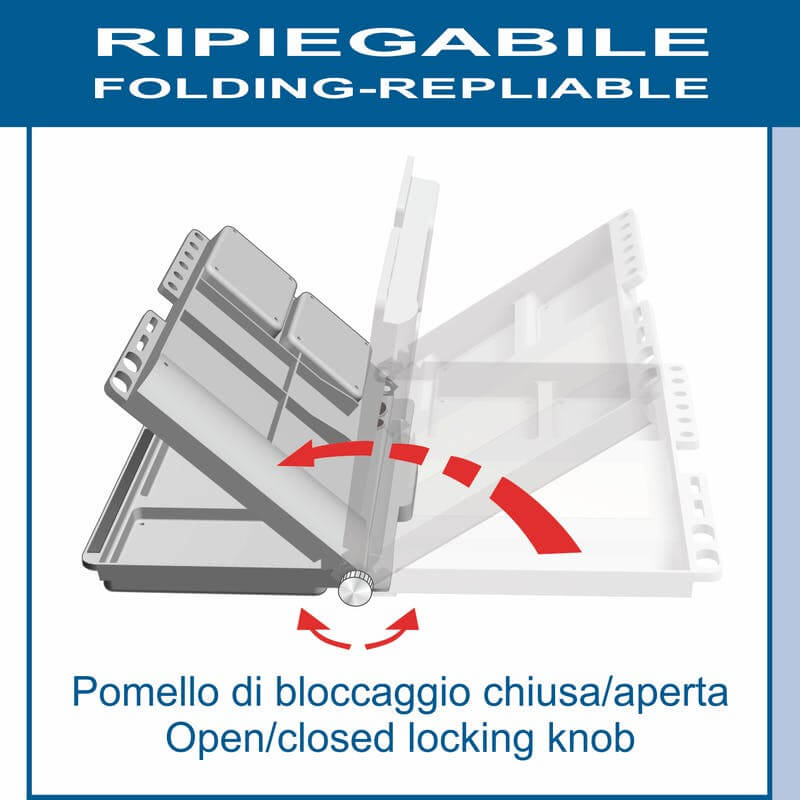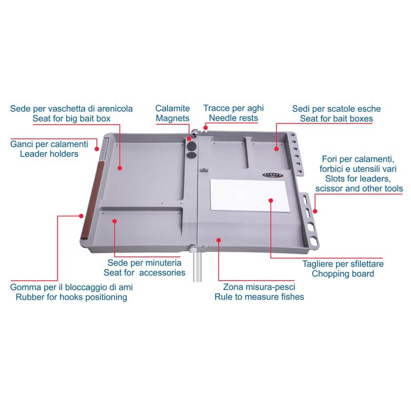 Serbidora ripiegabile e leggera progettata per venire incontro alle molteplici esigenze del pescatore. La sua struttura in materiale plastico resistentissimo è perfettamente smussata e priva di angoli taglienti. Le nicchie di cui è munita possono contenere varie vaschette porta-esche in posizione perfettamente stabile. Altre caratteristiche importanti fanno di questa serbidora un vero e proprio completo banco di lavoro. Attacco a vite metallica universale per paletto posto centralmente. Massima leggerezza gr 700. Dimensioni cm 45×36. Minimo ingombro da chiusa cm 36×26.