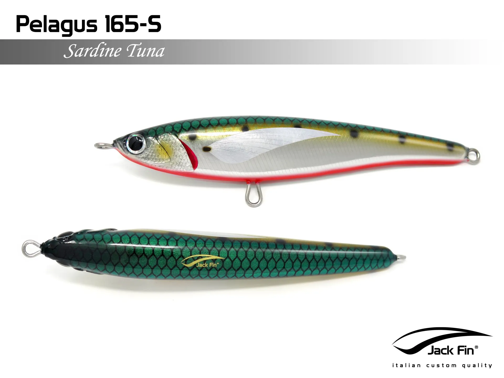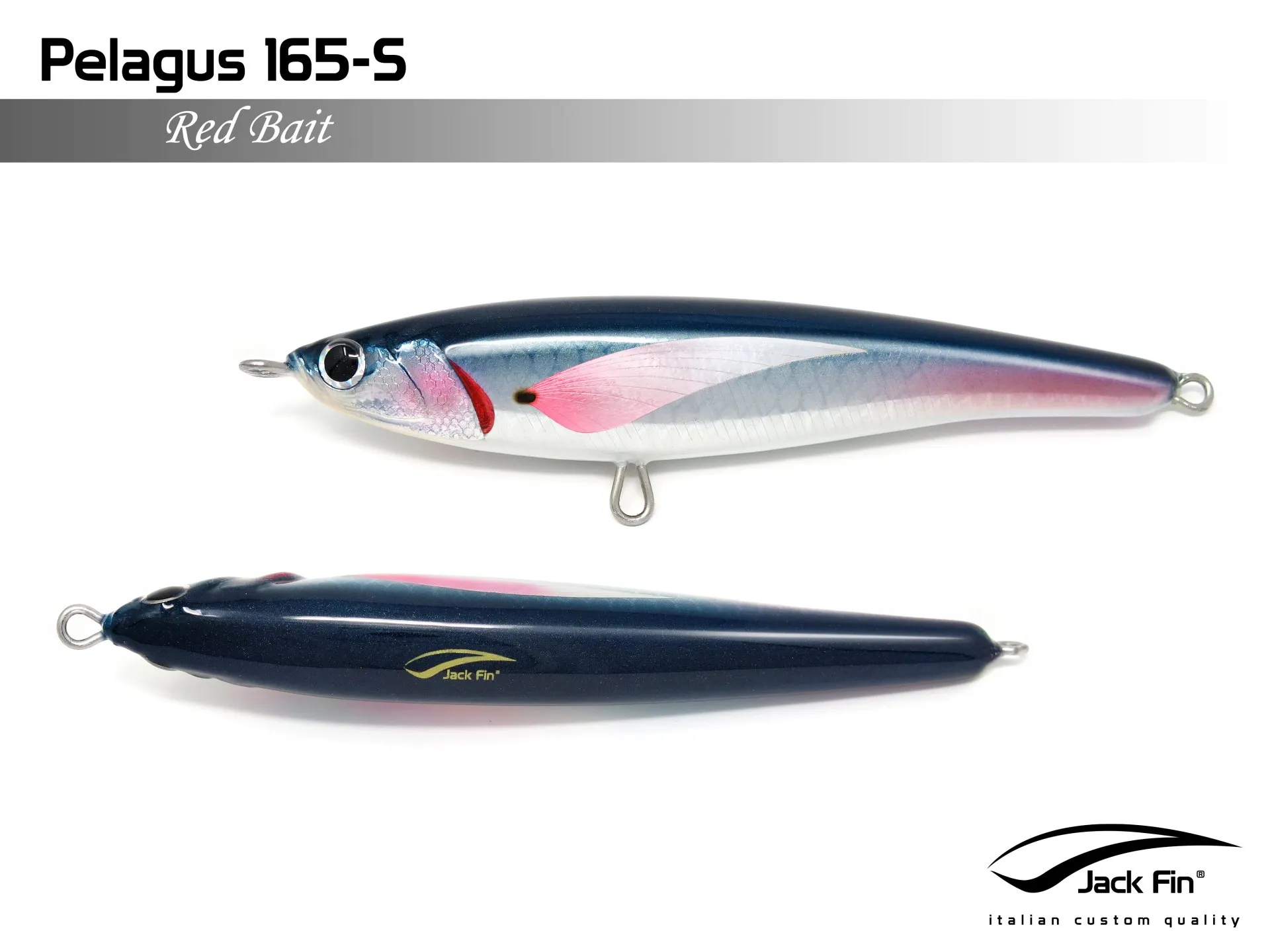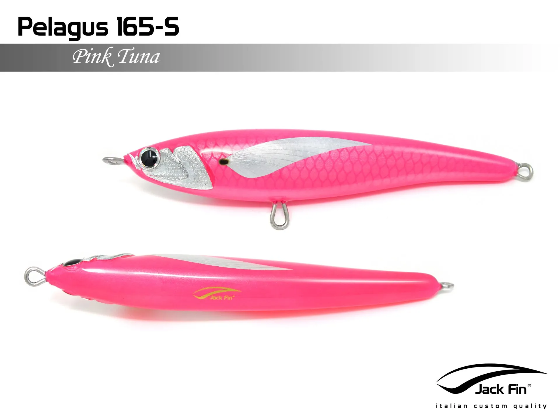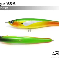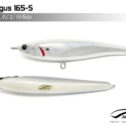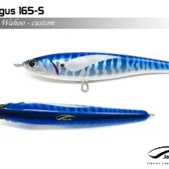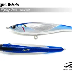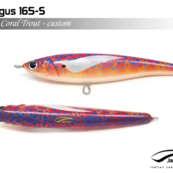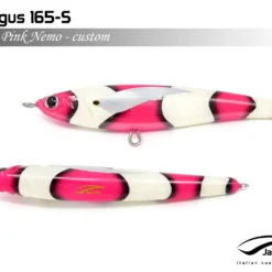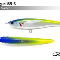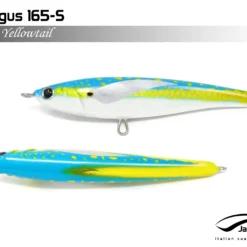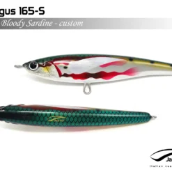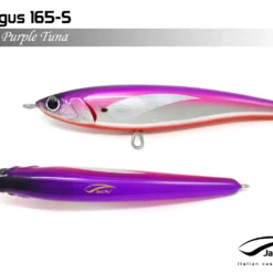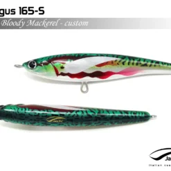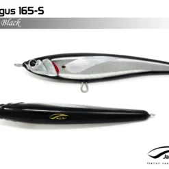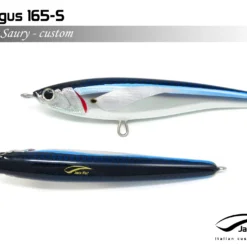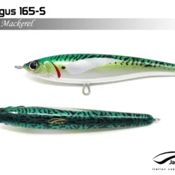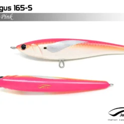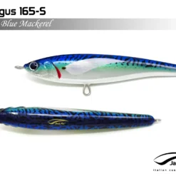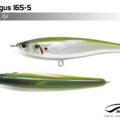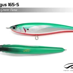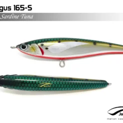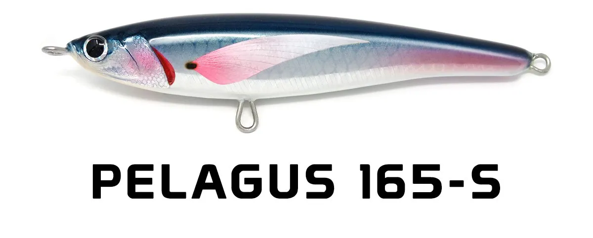 Pelagus 165-S è uno stick-bait affondante studiato appositamente per la pesca del Tonno Rosso. La sua particolare azione lo rende ottimo sia per la pesca frenetica sia in presenza di Tonni apatici a caccia di piccoli branchi di foraggio. Durante la fase di affondamento, la sua azione “wobbling” è in grado di attirare l’attenzione del tonno da notevole distanza. Grazie alla sua versatilità, il Pelagus 165 si presta a molteplici azioni di recupero e la sua aerodinamicità assicura grandi performance di lancio.