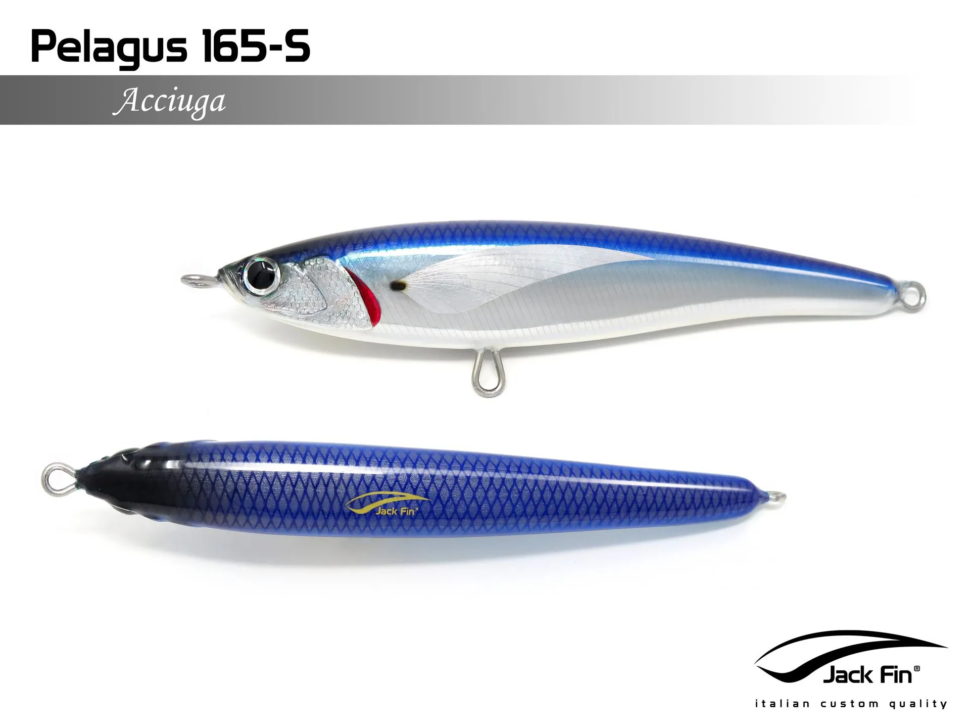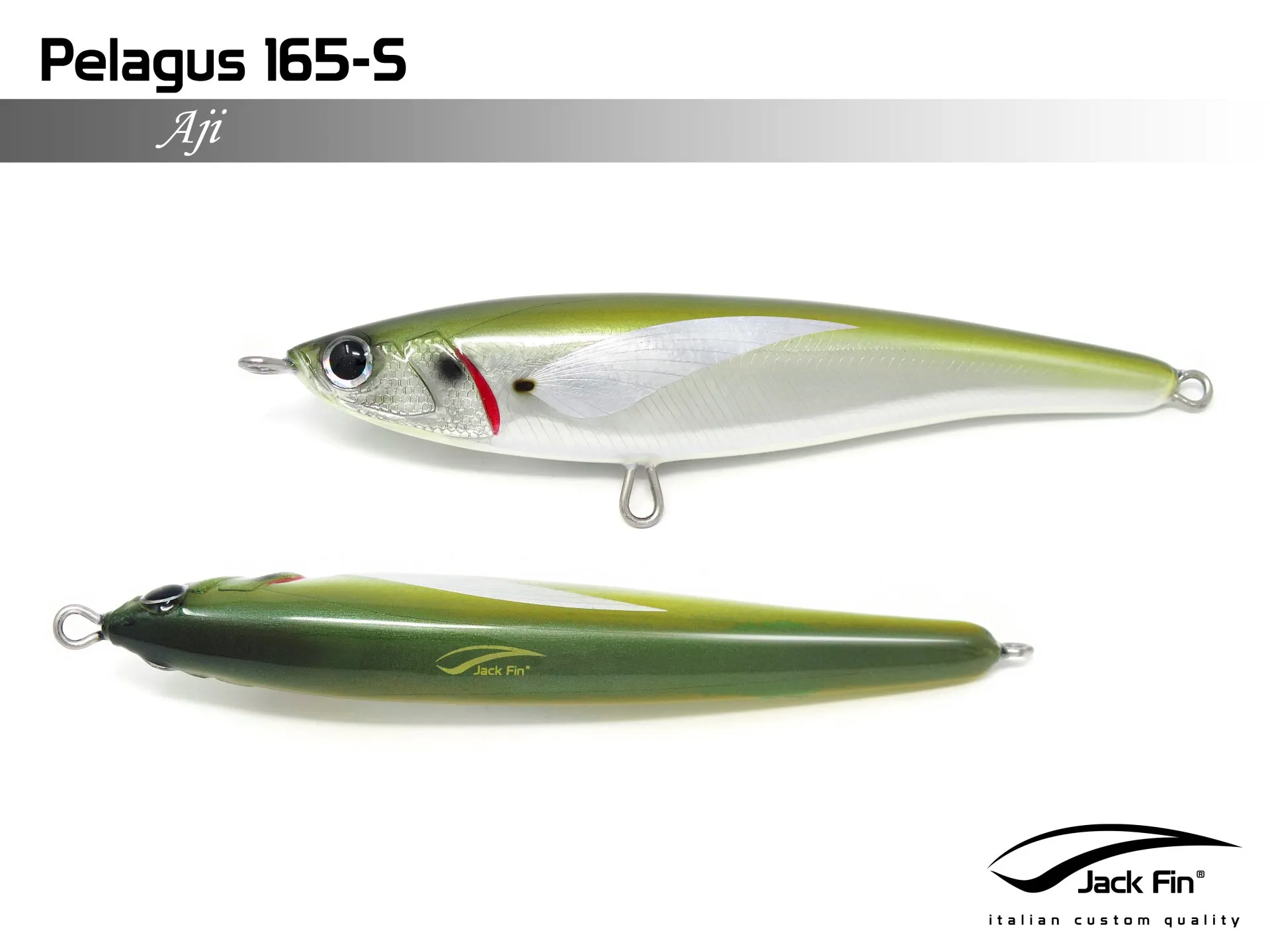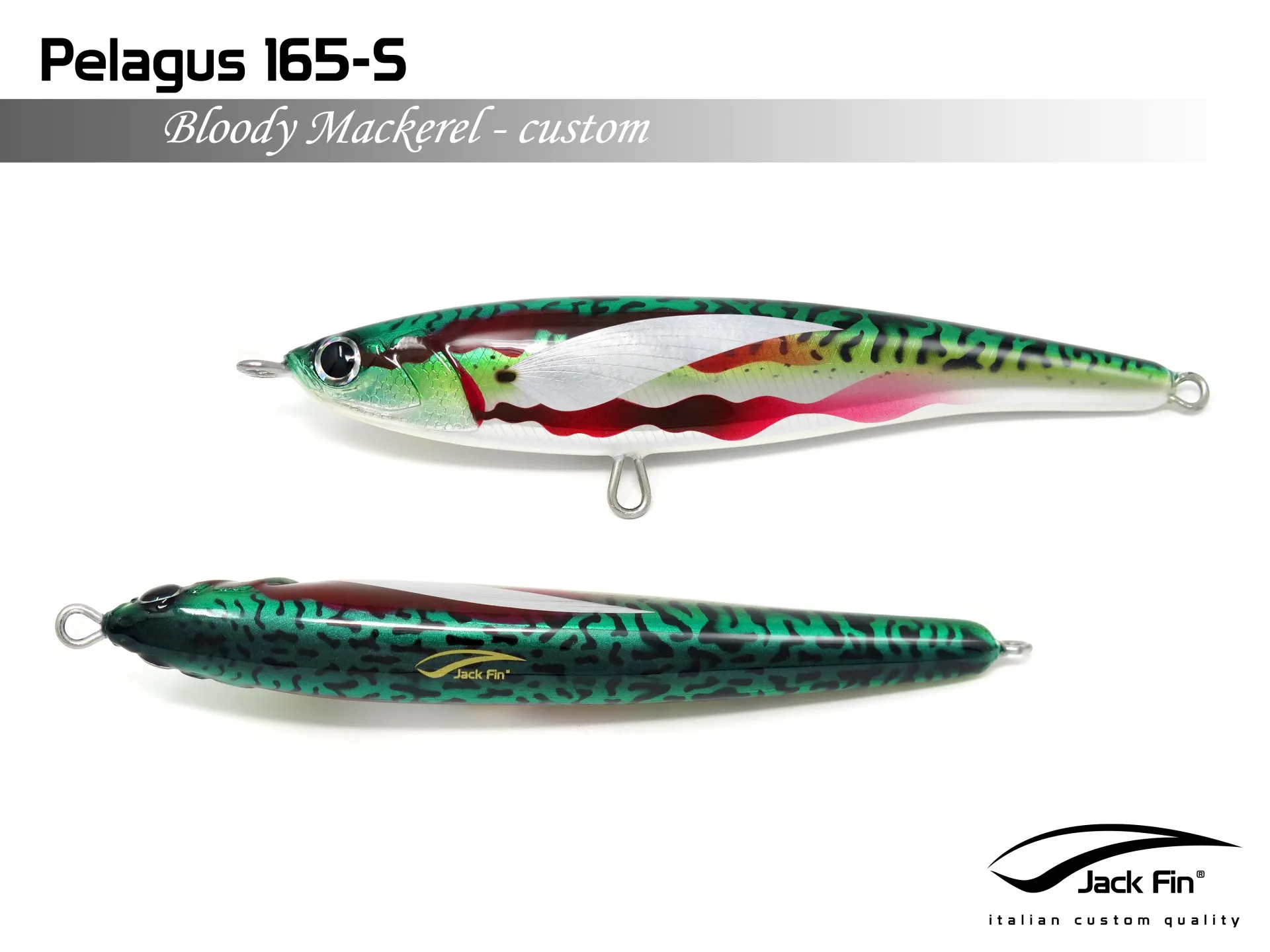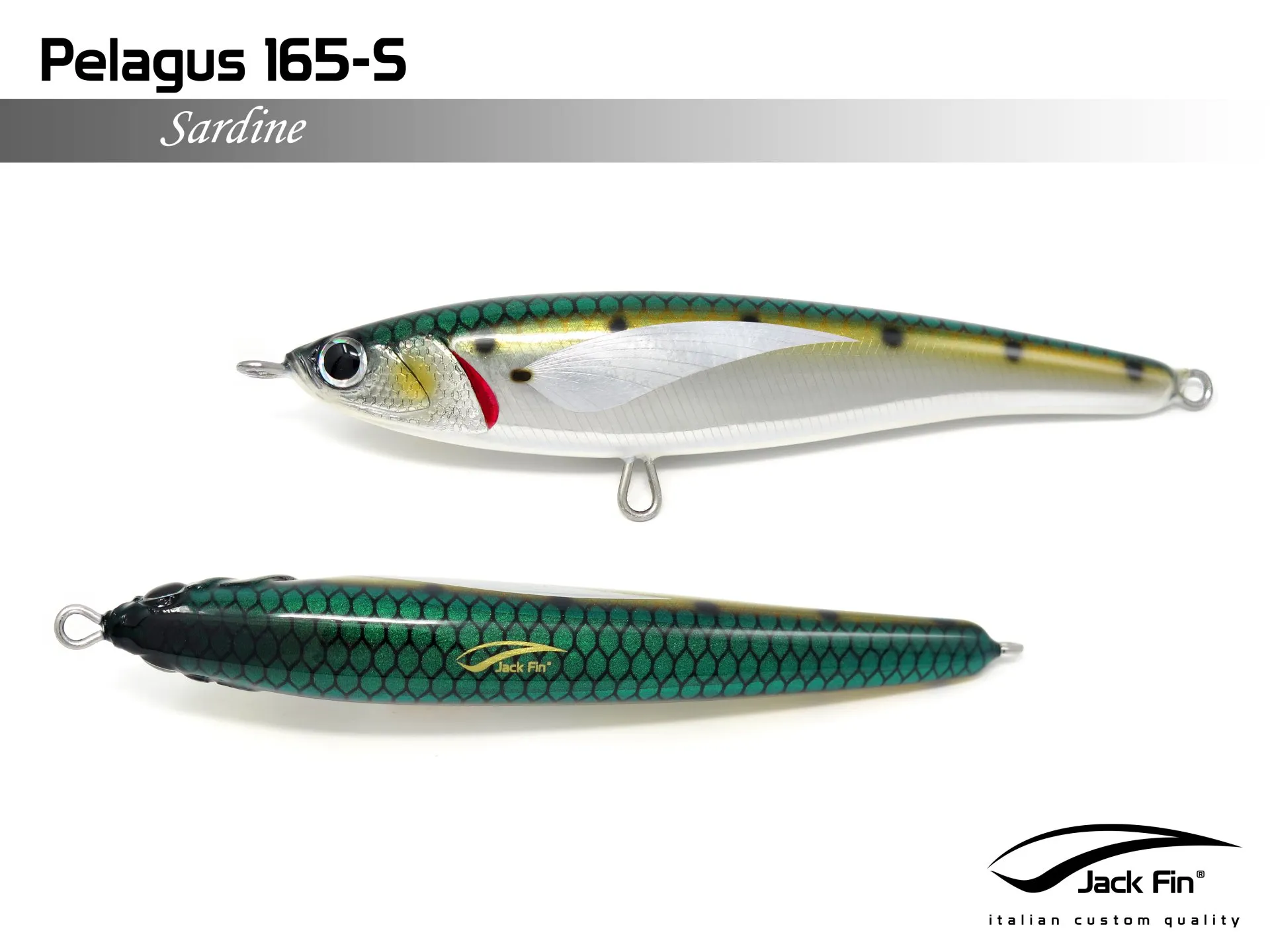 Pelagus 165-S è uno stick-bait affondante studiato appositamente per la pesca del Tonno Rosso. La sua particolare azione lo rende ottimo sia per la pesca frenetica sia in presenza di Tonni apatici a caccia di piccoli branchi di foraggio. Durante la fase di affondamento, la sua azione “wobbling” è in grado di attirare l’attenzione del tonno da notevole distanza. Grazie alla sua versatilità, il Pelagus 165 si presta a molteplici azioni di recupero e la sua aerodinamicità assicura grandi performance di lancio.