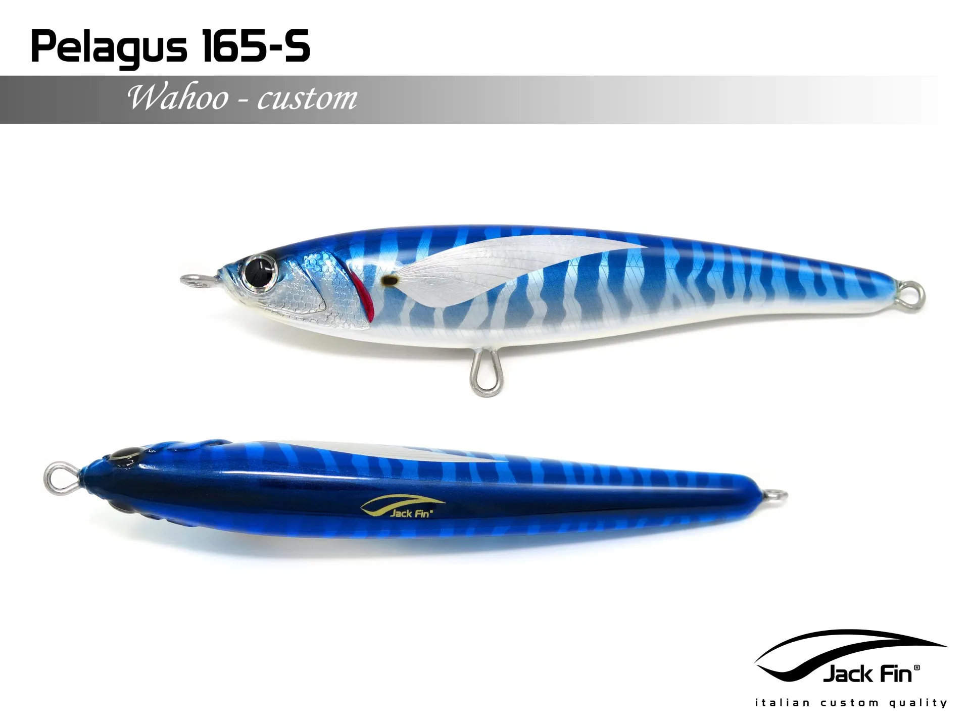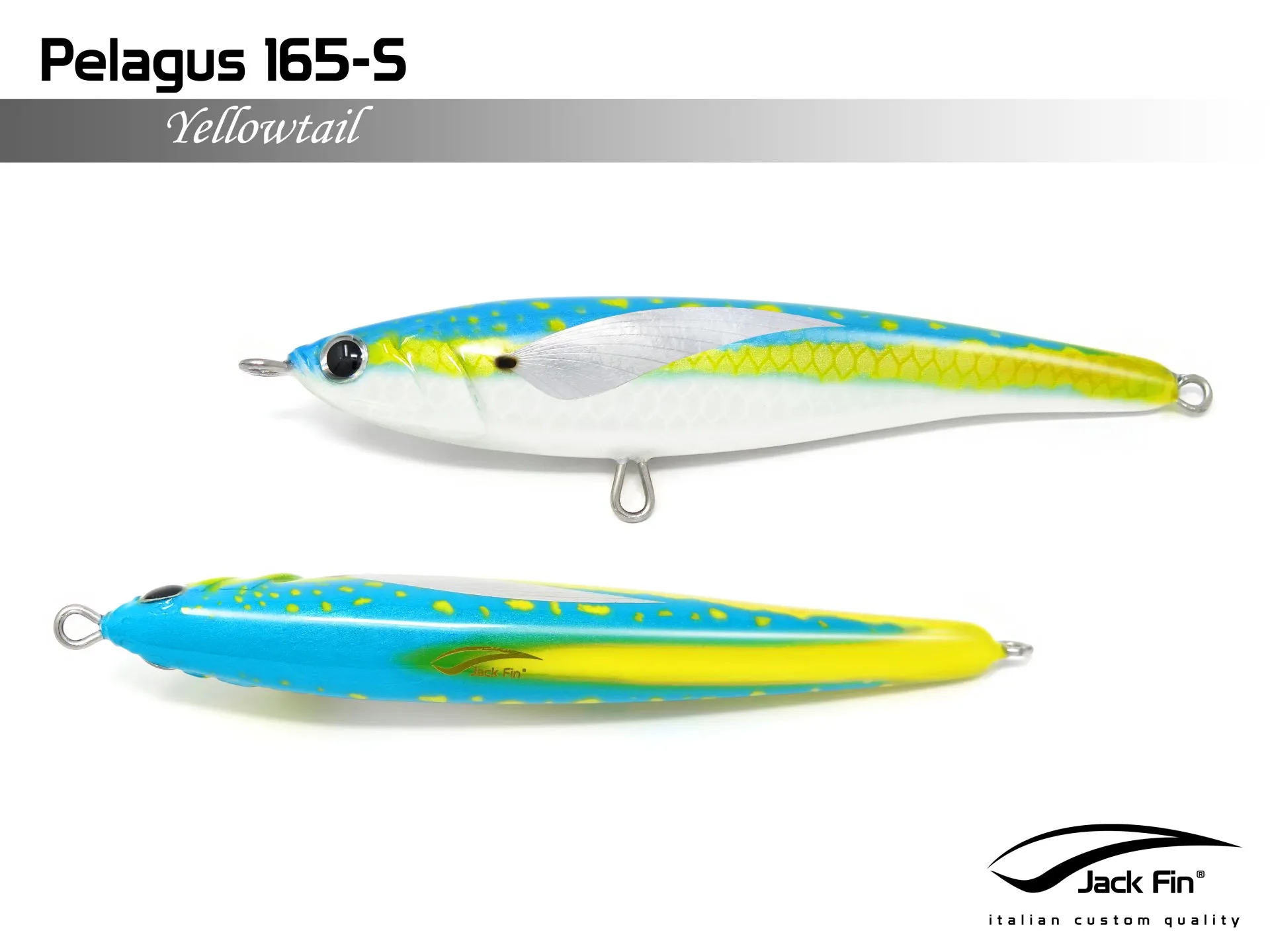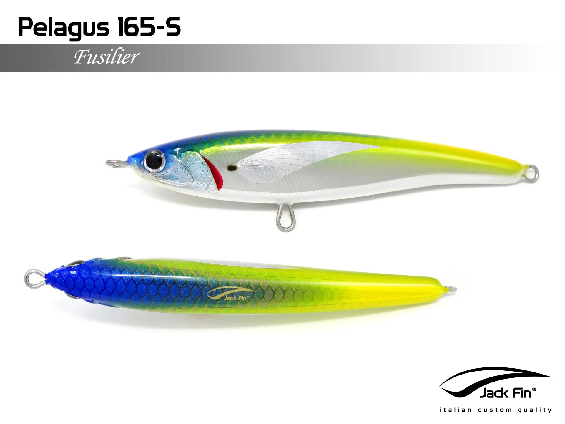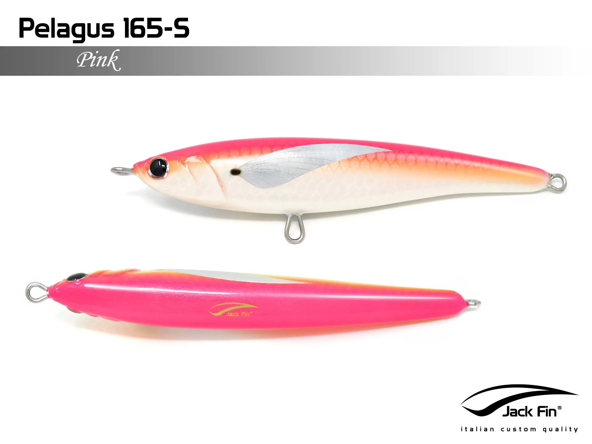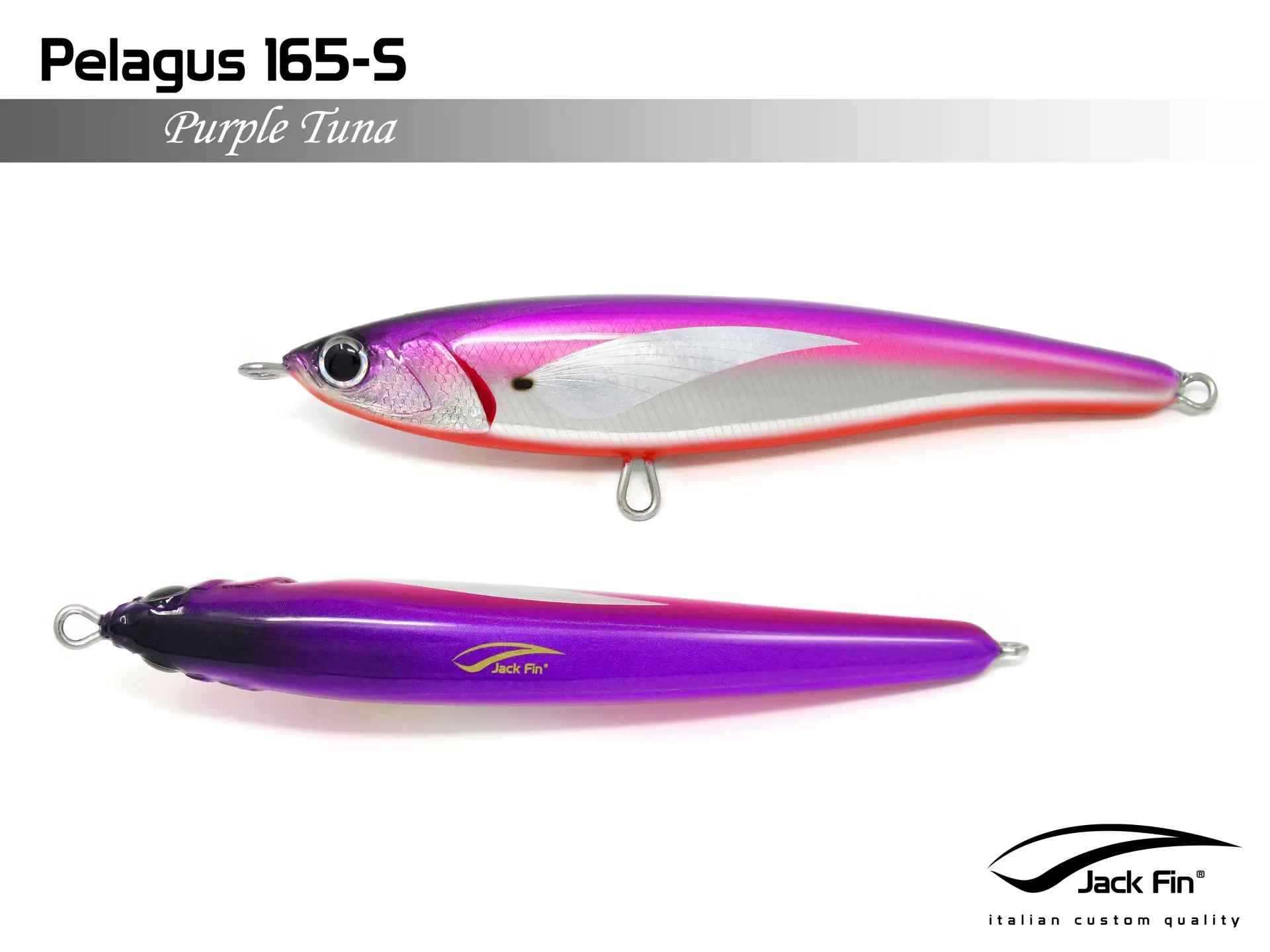 Pelagus 165-S è uno stick-bait affondante studiato appositamente per la pesca del Tonno Rosso. La sua particolare azione lo rende ottimo sia per la pesca frenetica sia in presenza di Tonni apatici a caccia di piccoli branchi di foraggio. Durante la fase di affondamento, la sua azione “wobbling” è in grado di attirare l’attenzione del tonno da notevole distanza. Grazie alla sua versatilità, il Pelagus 165 si presta a molteplici azioni di recupero e la sua aerodinamicità assicura grandi performance di lancio.