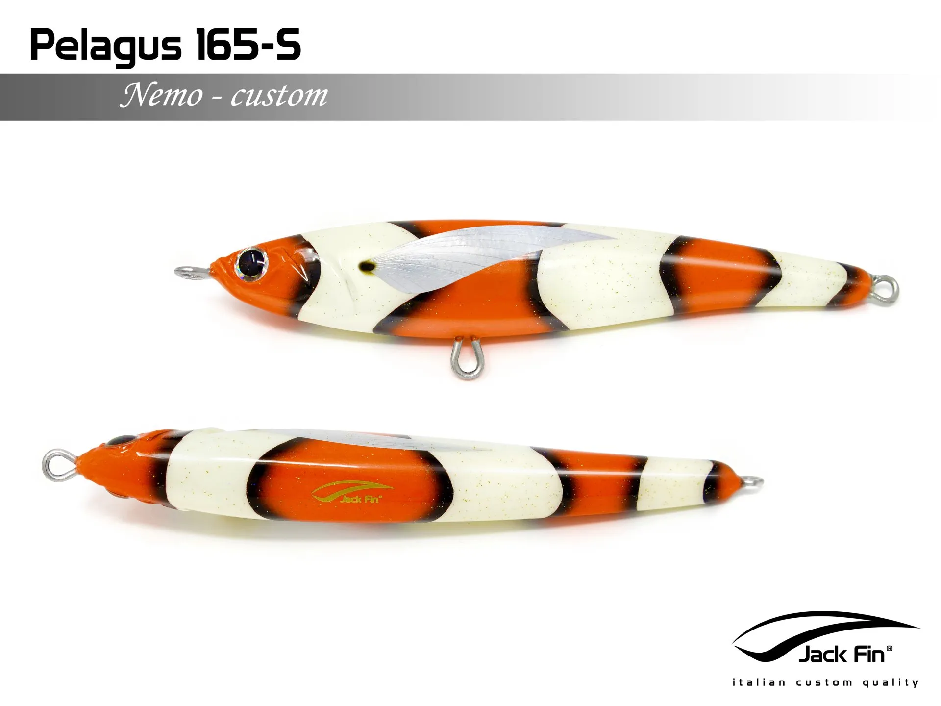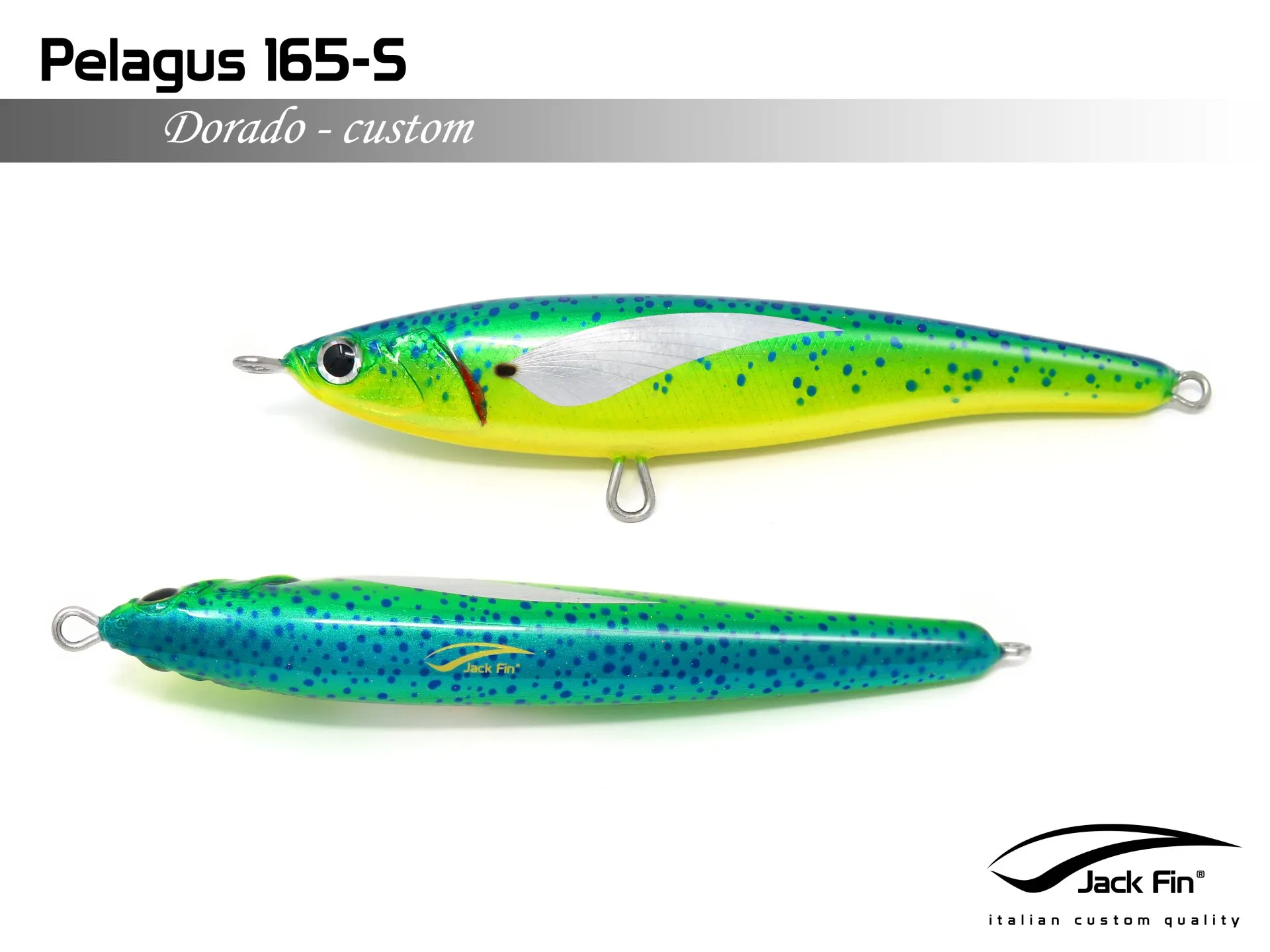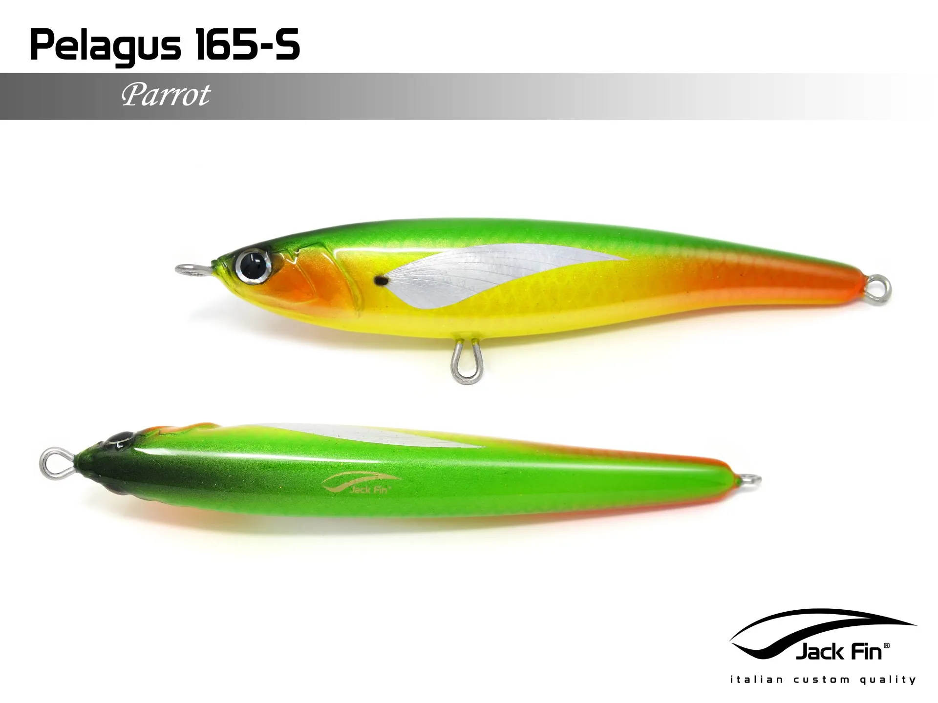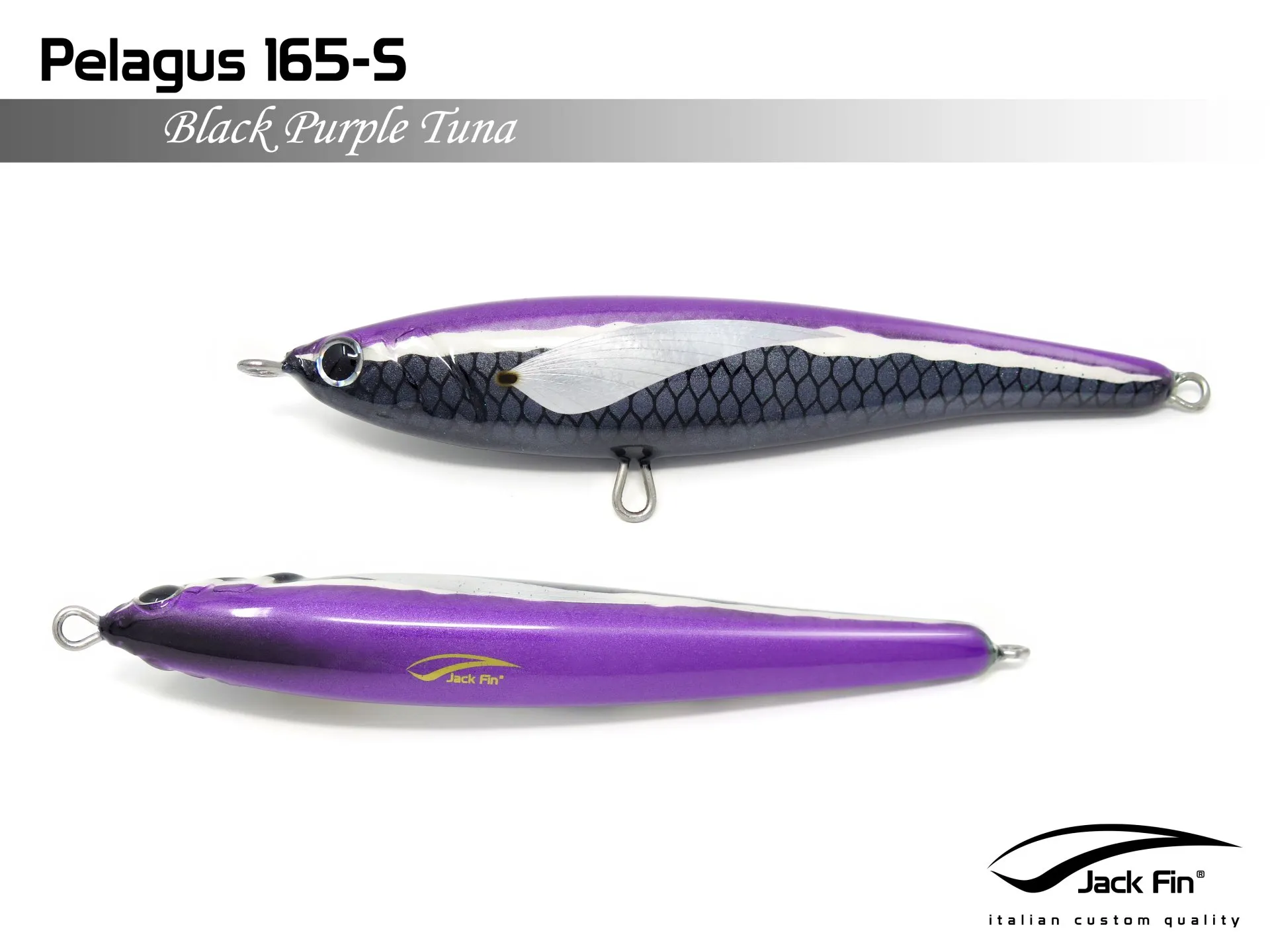 Pelagus 165-S è uno stick-bait affondante studiato appositamente per la pesca del Tonno Rosso. La sua particolare azione lo rende ottimo sia per la pesca frenetica sia in presenza di Tonni apatici a caccia di piccoli branchi di foraggio. Durante la fase di affondamento, la sua azione “wobbling” è in grado di attirare l’attenzione del tonno da notevole distanza. Grazie alla sua versatilità, il Pelagus 165 si presta a molteplici azioni di recupero e la sua aerodinamicità assicura grandi performance di lancio.