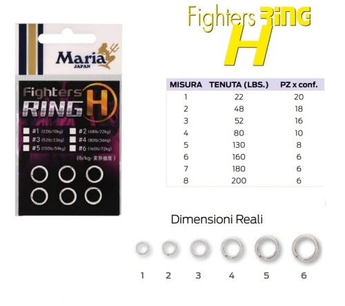 Maria Fighters Ring H sono anelli split, creati per connettere amo o ancoretta ai nostri artificiali, oppure per collegare ad essi il terminale. Sono molto utilizzati in tutte le tipologie di spinning, e proprio per coprire tutte le esigenze di pesca vengono prodotti in otto differenti misure.