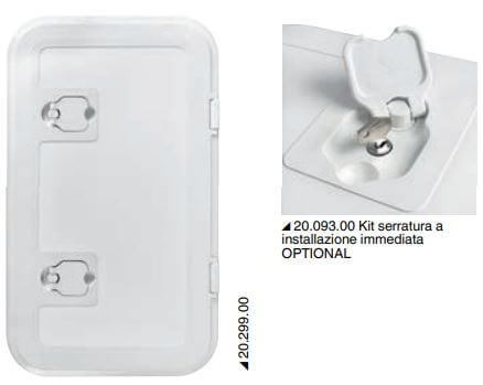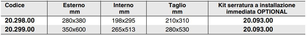| Articolo | Esterno mm | Interno mm | Taglio mm | Kit serratura a installazione immediata OPTIONAL |