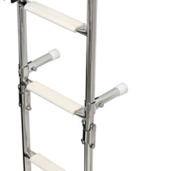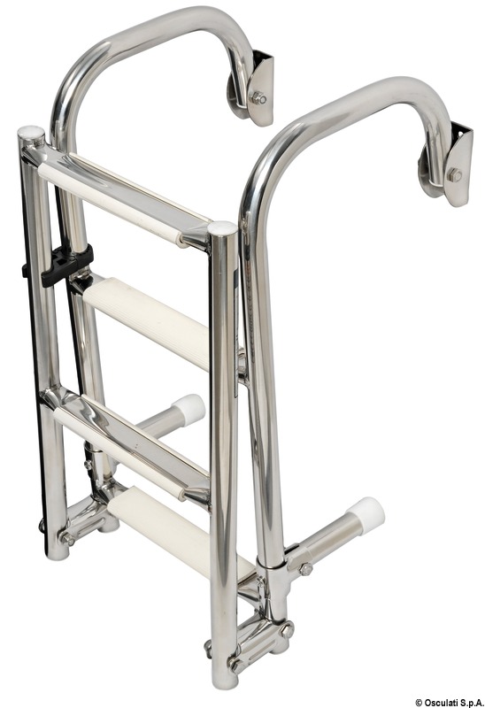 In acciaio inox lucidato a specchio con attacchi arcuati sopra coperta, per una più comoda risalita. Modello con gradini con superficie ovalizzata. Il gradino ovale, rispetto ai tradizionali tondi, é molto più agevole e comodo nell’uso. I gradini nella parte superiore sono ricoperti di pedana in plastica antiscivolo.